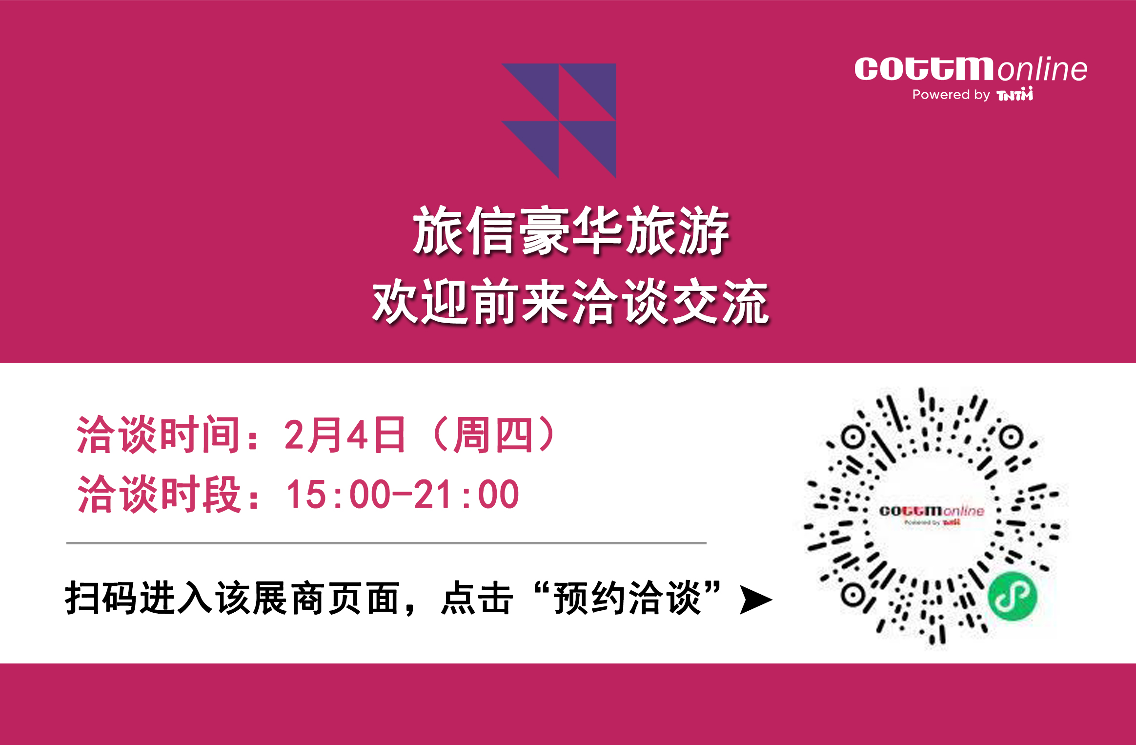 2月4日,三家欧洲顶级目的地供应商:Iceland Europe Travel(IET)、旅信豪华旅游、J&K长途客车有限公司与您相约COTTM Online线上洽谈室,为业者朋友们介绍欧洲地区丰富多彩的旅游资源,以及各自的疫后产品。欢迎来线上预约咨询。